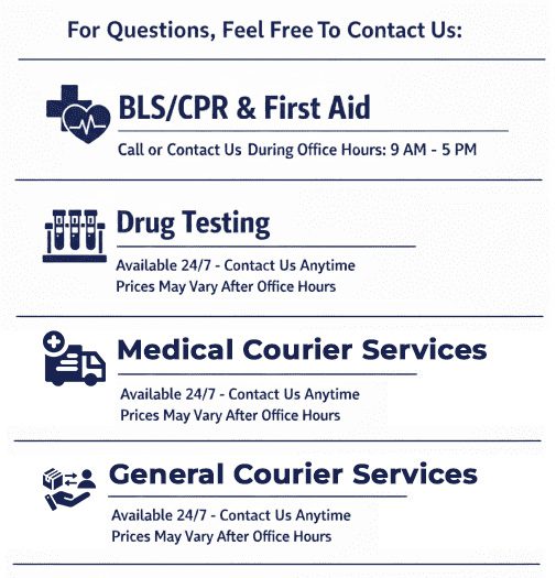 At AWF The Charts, we are committed to delivering accurate, reliable, and compliant drug testing, life-saving training, and professional courier services. Our certified professionals provide hands-on BLS/CPR and First Aid courses, mobile/portable testing, and secure Medical and Business/General Courier Services, ensuring timely and compliant transportation of medical specimens, supplies, and important business materials with care, precision, and dedication to every client’s needs.
